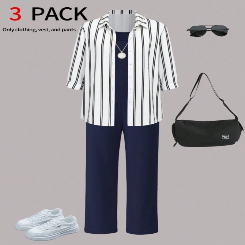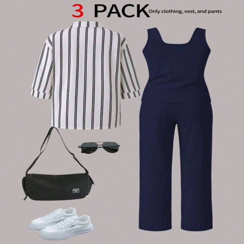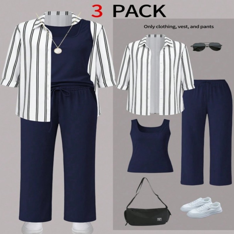 Conjunto de 3 piezas de ropa casual para mujer: chaqueta de camisa a rayas, top sin mangas de cuello cuadrado y pantalones de pierna ancha de cintura elástica, adecuado para ir al trabajo, otoño/invierno