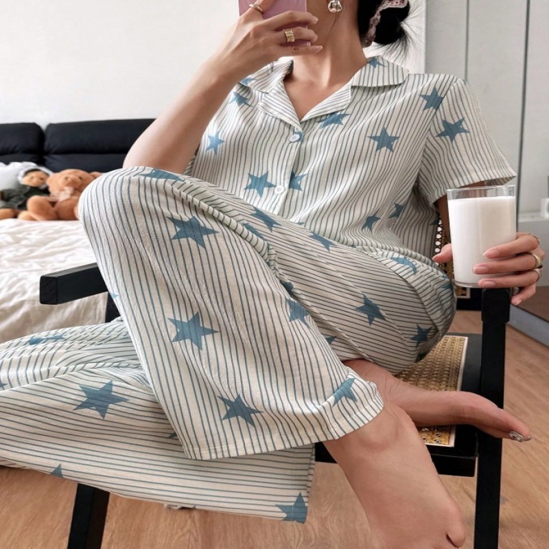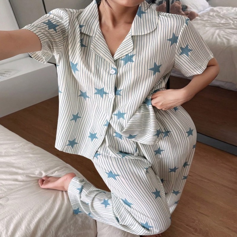 SHEIN Conjunto de pijama de mujer con cardigan casual de solapa con estampado de estrellas y rayas