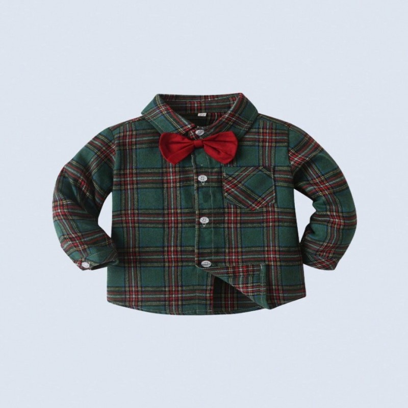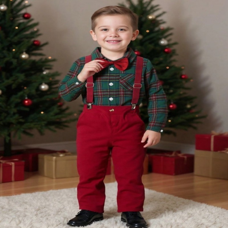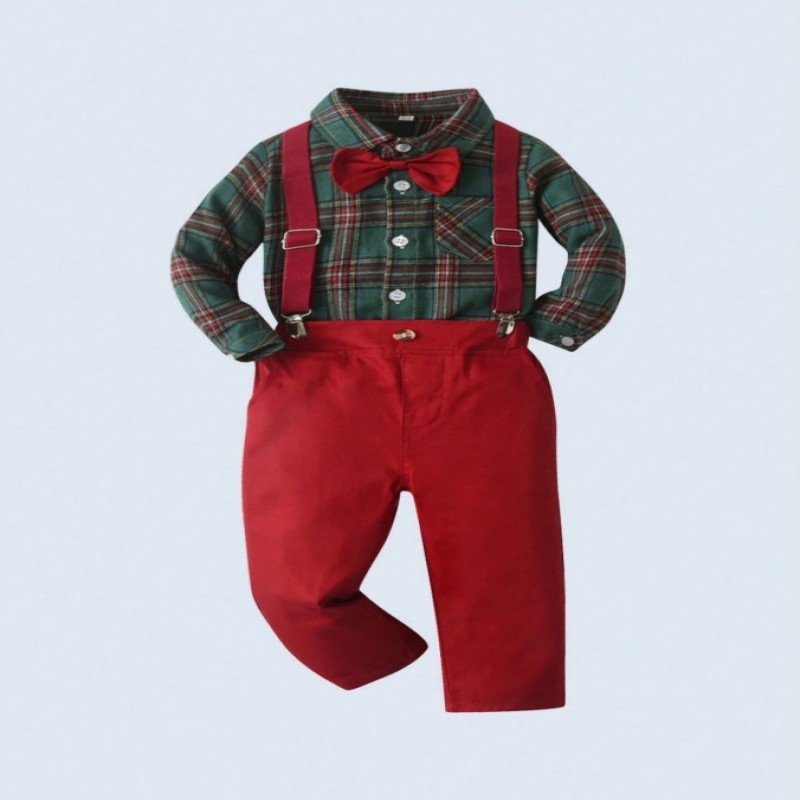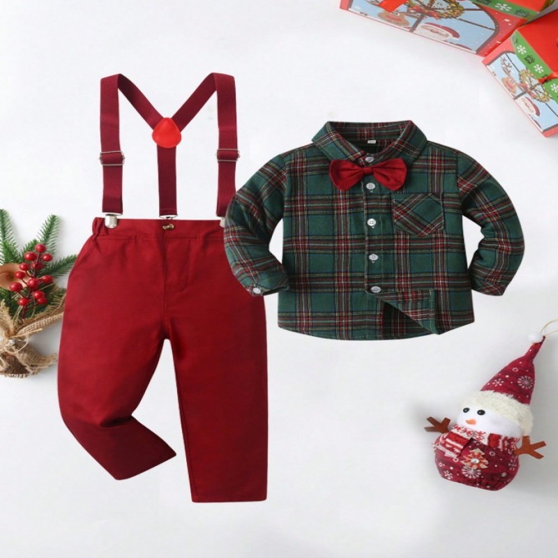 BOARNSEORL 2 piezas Conjunto de caballero para niños pequeños - Camisa de manga larga a cuadros verdes con pajarita y pantalones con tirantes, de moda para fiesta de cumpleaños, Nochevieja, boda, baby shower, Navidad