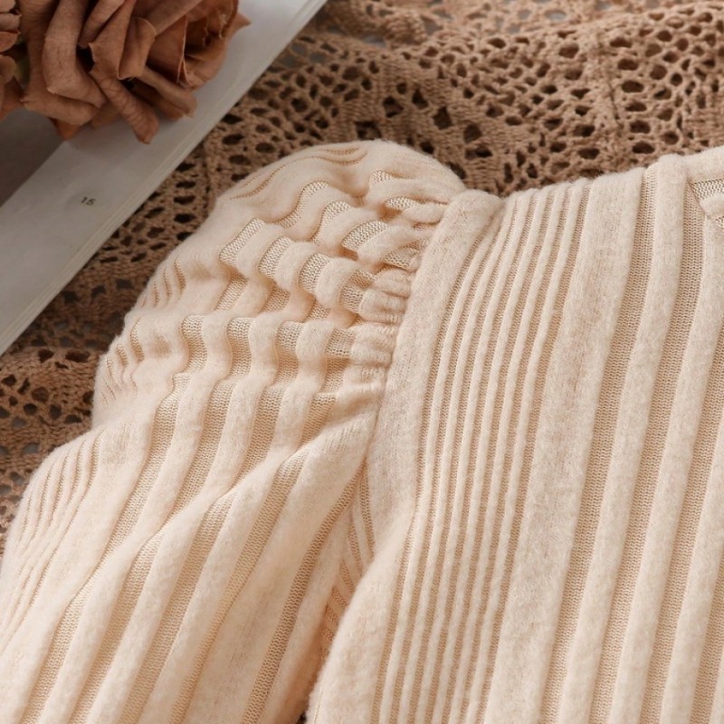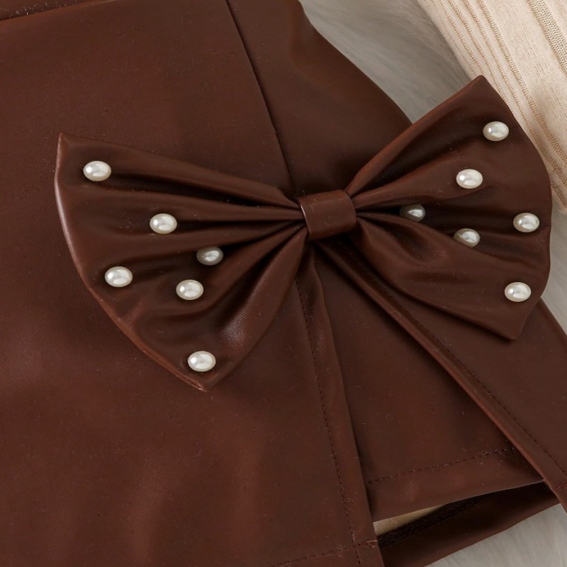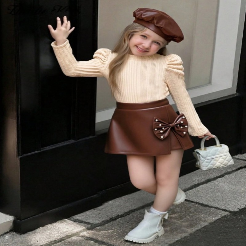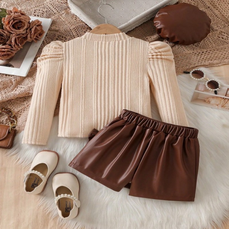 Sparklyn Conjunto de 3 piezas de moda y elegante para niñas: Top de punto acanalado de manga abullonada + Pantalones cortos con lazo de cuentas + Boina, Otoño/Invierno