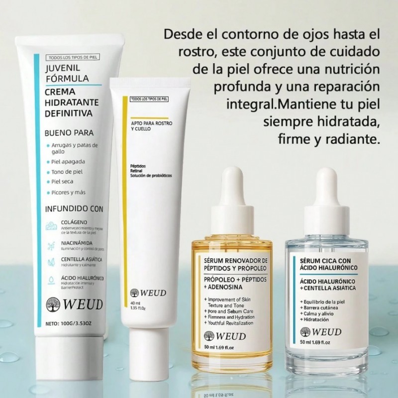 WEUD Kit Experiencia Premium: 4 Sérums para Equilibrio y Luminosidad Natural | Texturas Ligeras No Grasas, Día/Noche | Con Ácido Hialurónico, Péptidos, Propóleo, Retinol Nocturno